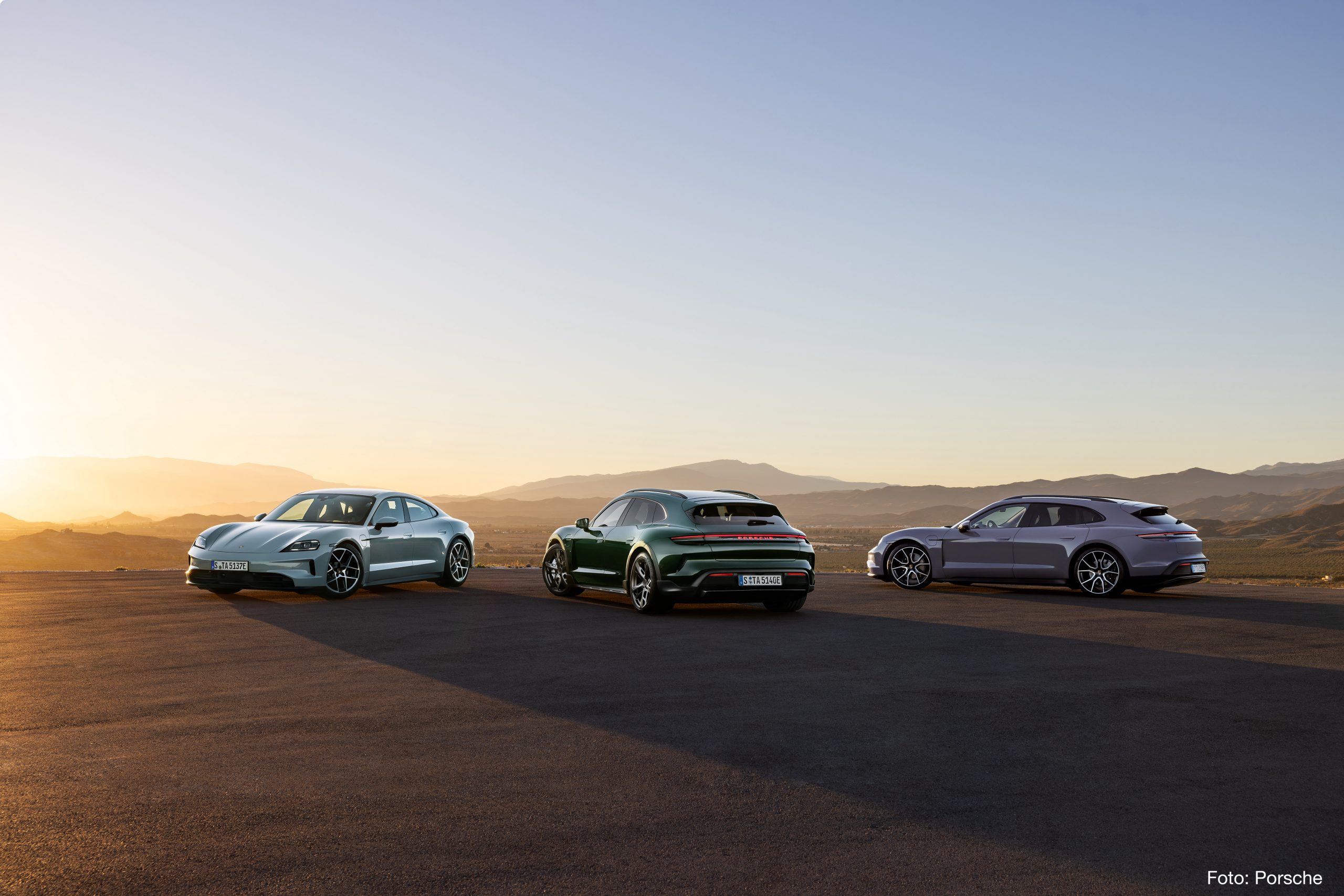 Der Taycan ist der erste Vollelektriker von Porsche. Drei Karosserieversionen: Limousine plus Kombi Sport Turismo plus Kombi Cross Turismo.